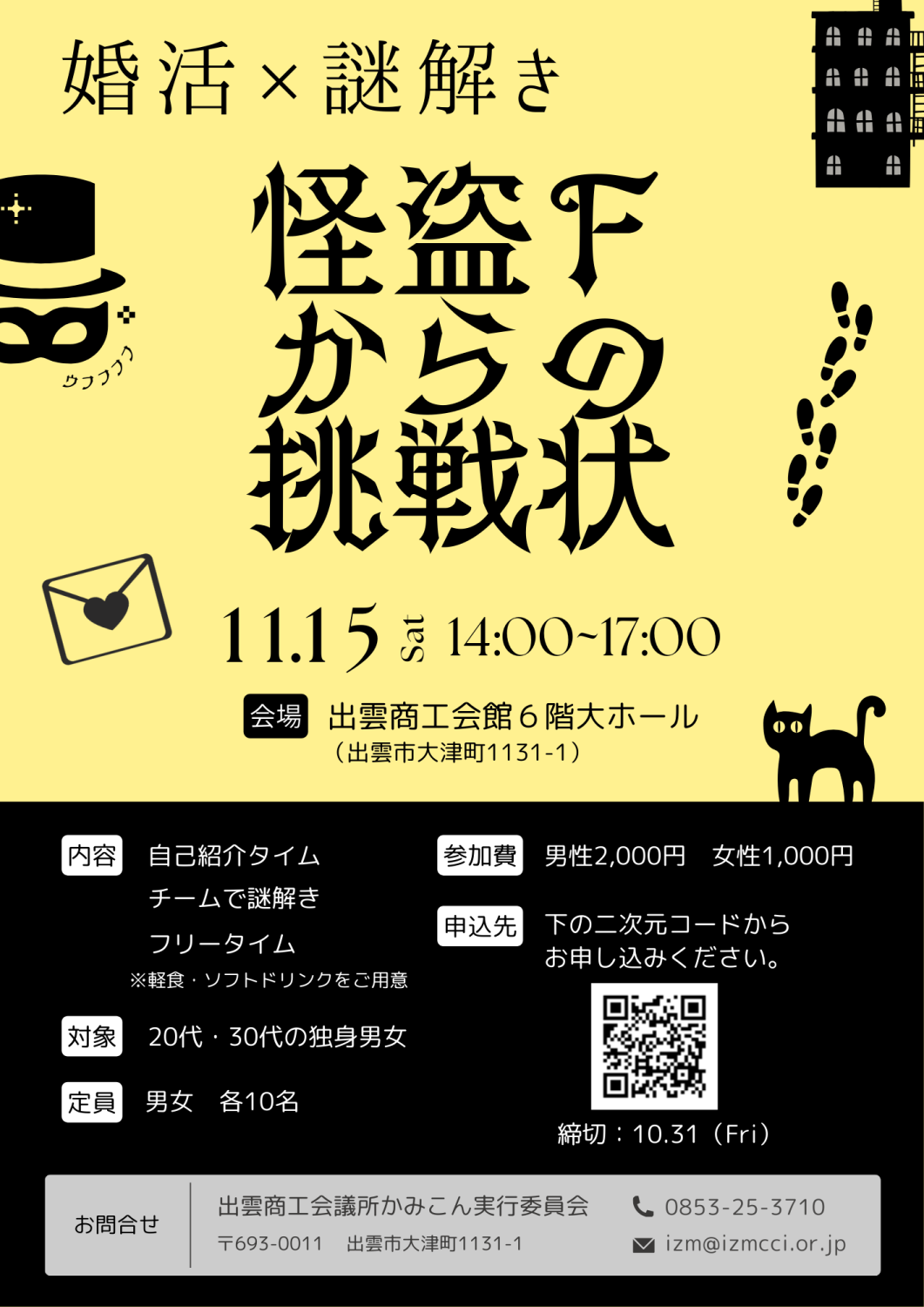 内容 | 出雲商工会議所主催の婚活イベント第3弾! 今年度2回目となるイベントテーマは”謎解き”です。 チームで協力しながら、ミッションをクリアする中で素敵な出会いが生まれるかも・・・ 「楽しみながら出会いたい」 そんな方は怪盗Fからの挑戦にぜひ挑んでみてください! |